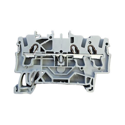Description: Feedthrough Terminal Block, 3 Conductor, 5.2mm, Rail Mount, Gray